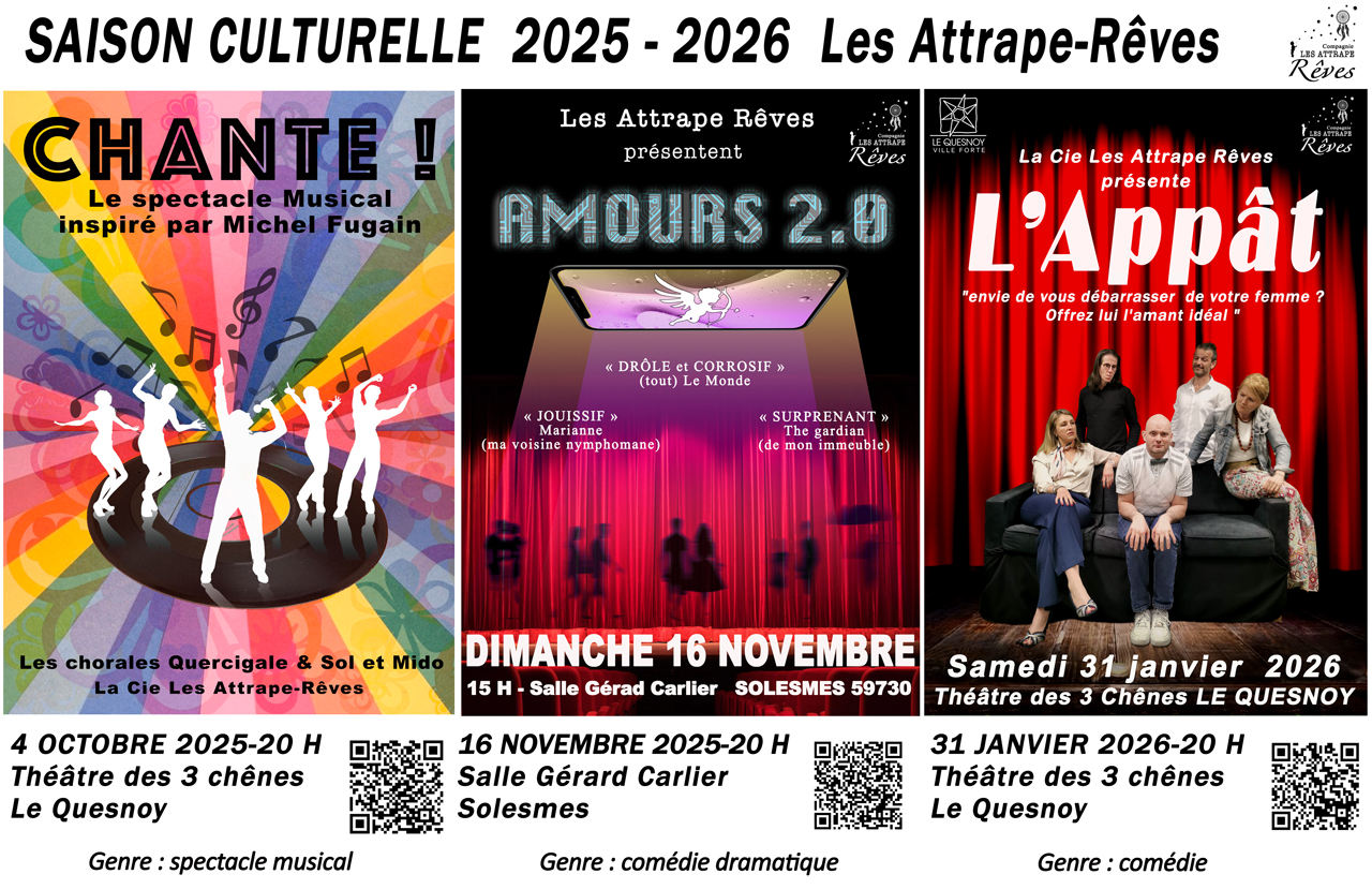 Cette année, les Attrape-Rêves fouleront par deux fois les planches du théâtre des 3 chênes avec Chante ! au profit d’Octobre Rose et l’Appât , notre toute nouvelle création.